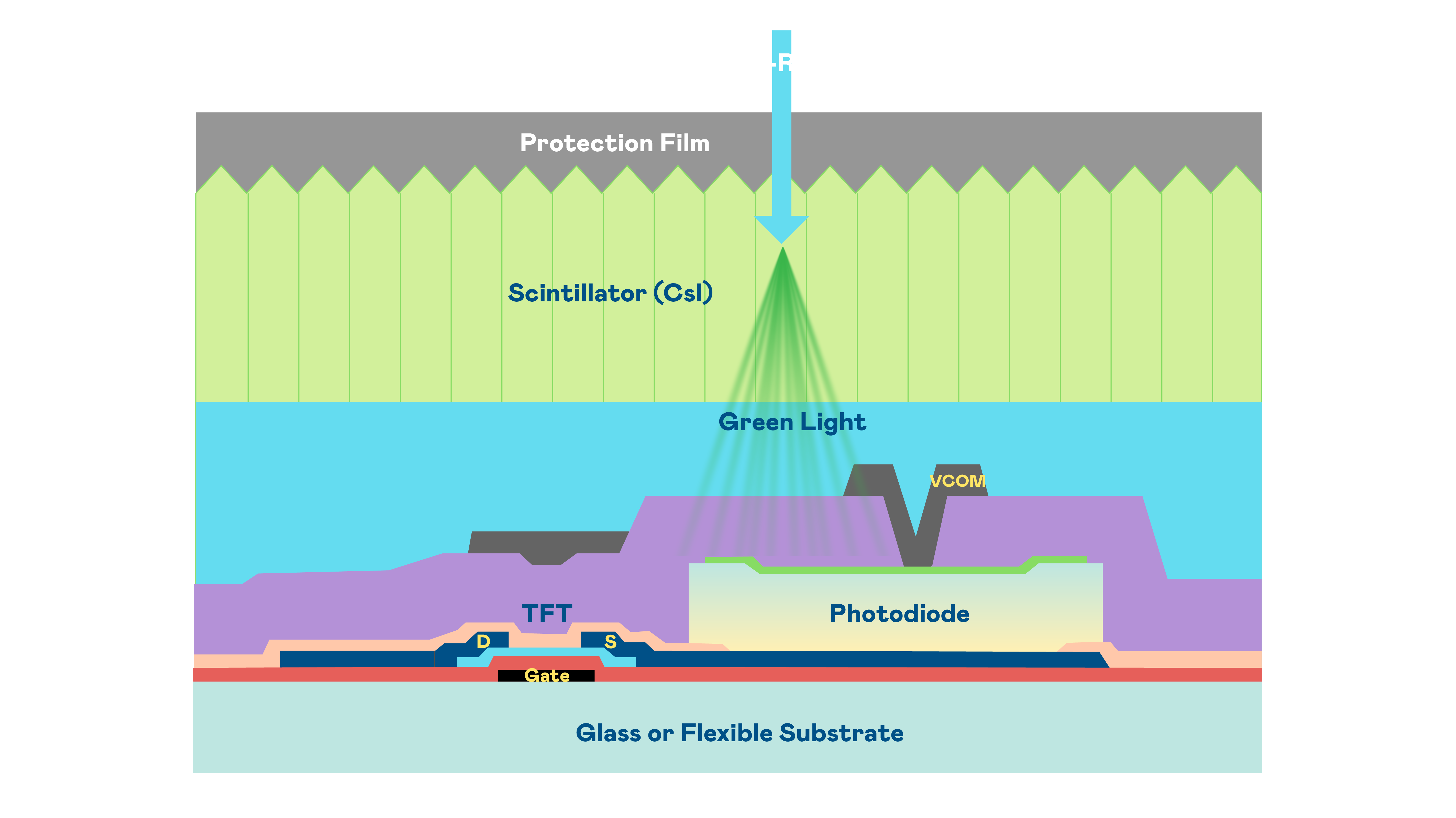 银河galaxy的X光影像感测阵列使用薄膜电晶体 (TFT) 作为每个像素的读取开关,搭配光电二极体(Photodiode)的光电转换元件,用以感测X光影像讯号。